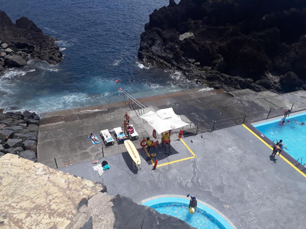 There’s a cafe, parasols and a big pool with a smaller Jacuzzi type pool. There’s access to the sea too.