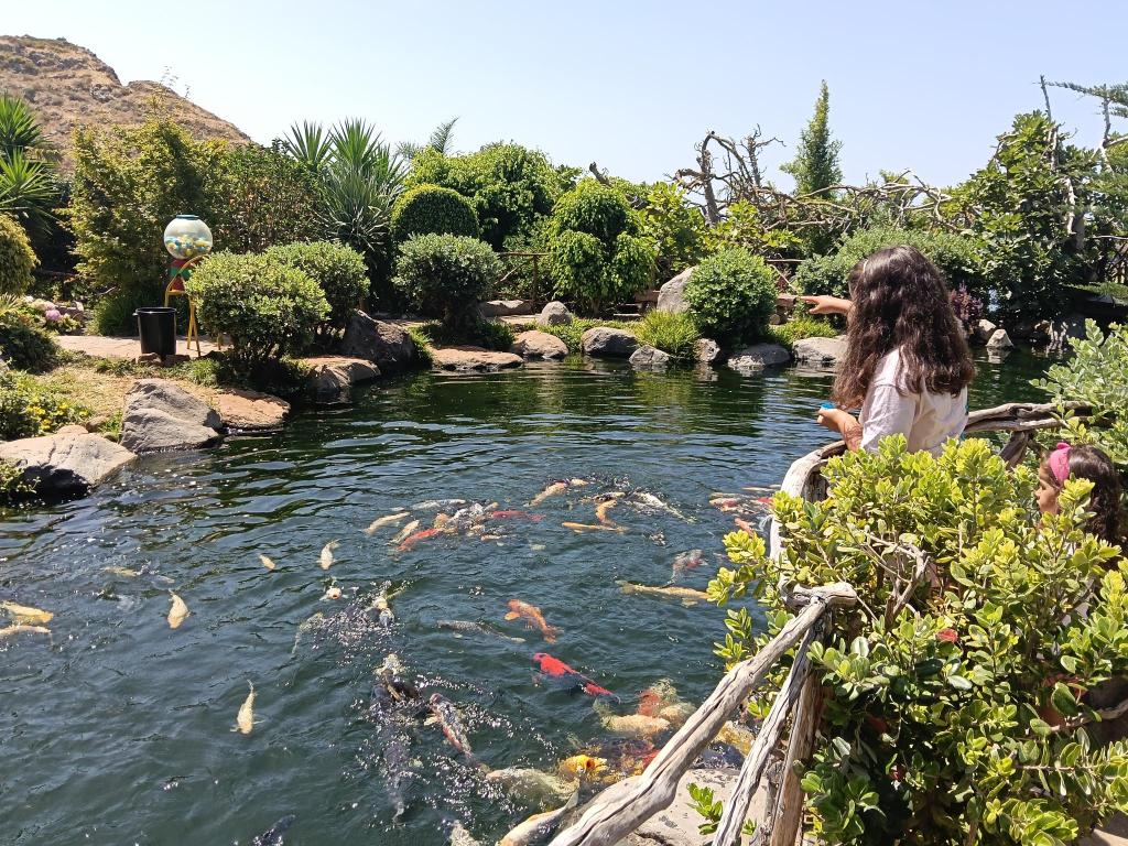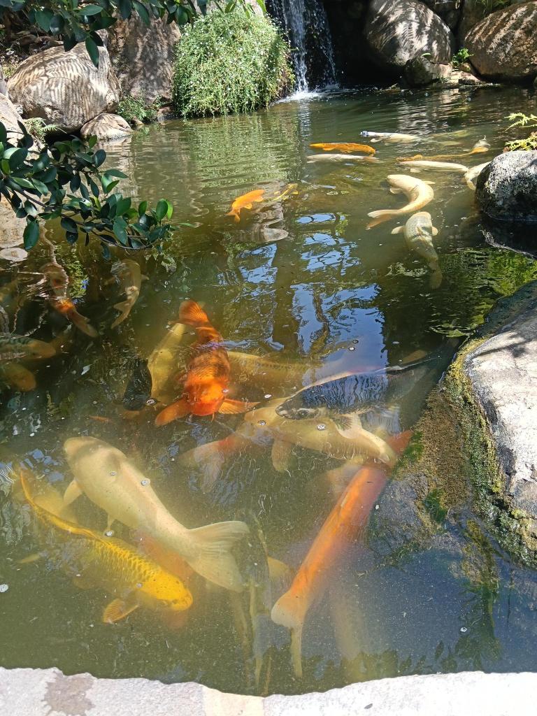 There are lots of ponds with small waterfalls. There must be thousands of enormous Koi Carp.