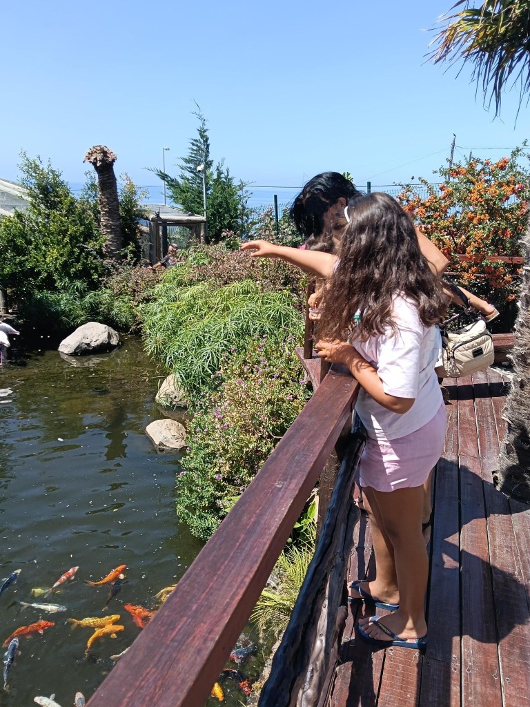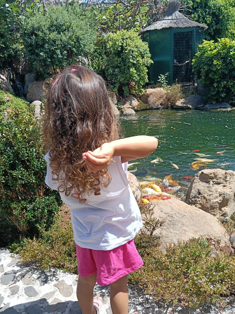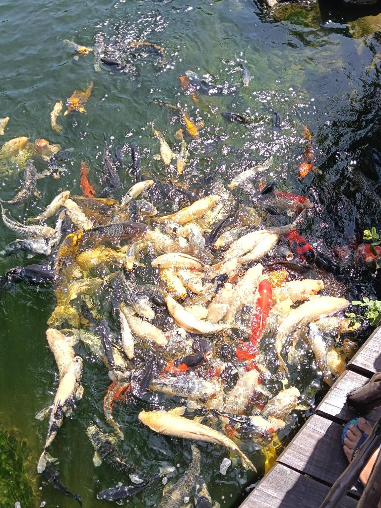 They grow to such a large size because there are dispensers around the ponds. You can buy fish food for 1 euro and feed them. The girls loved it. Bella was trying (and managed) to hit the fish on the head with the food.